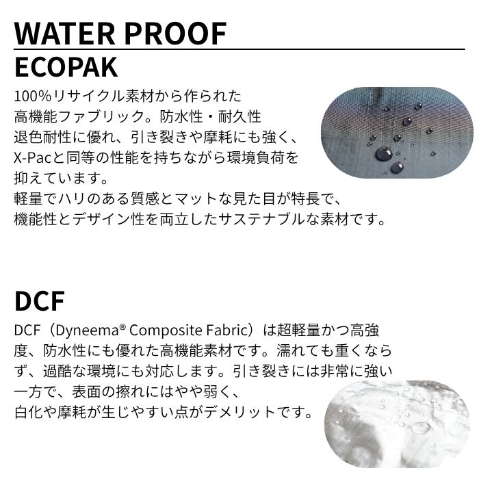 DCF(Dyneema® Composite Fabric)は超軽量かつ高強度、防水性にも優れた高機能素材です。濡れても重くならず、過酷な環境にも対応します。引き裂きには非常に強い一方で、表面の擦れにはやや弱く、白化や摩耗が生じやすい点がデメリットです。