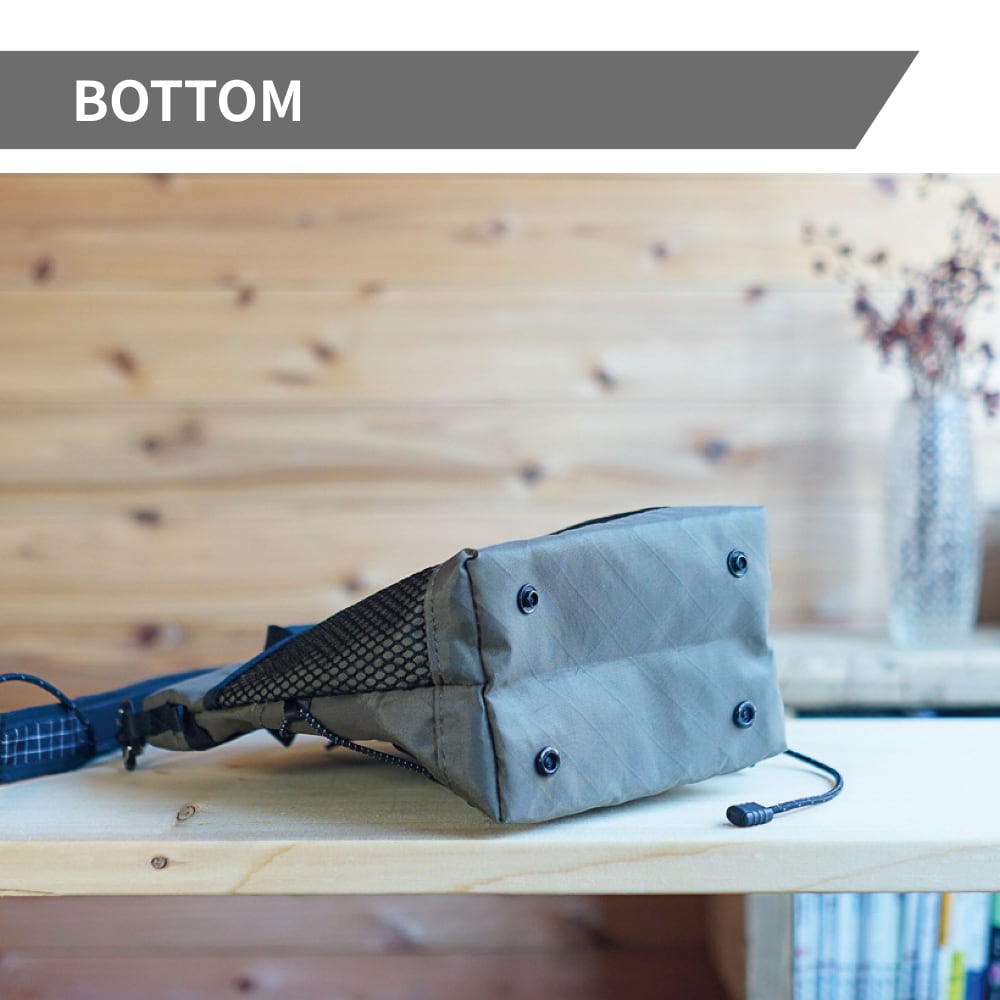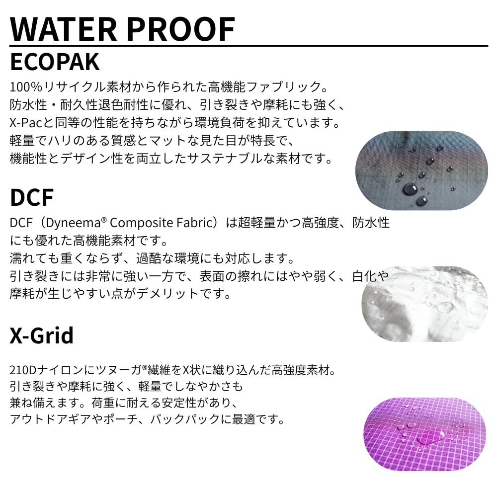 100%リサイクル素材から作られた高機能ファブリック。防水性・耐久性・退色耐性に優れ、引き裂きや摩耗にも強く、X-Pacと同等の性能を持ちながら環境負荷を抑えています。軽量でハリのある質感とマットな見た目が特長で、機能性とデザイン性を両立したサステナブルな素材です。